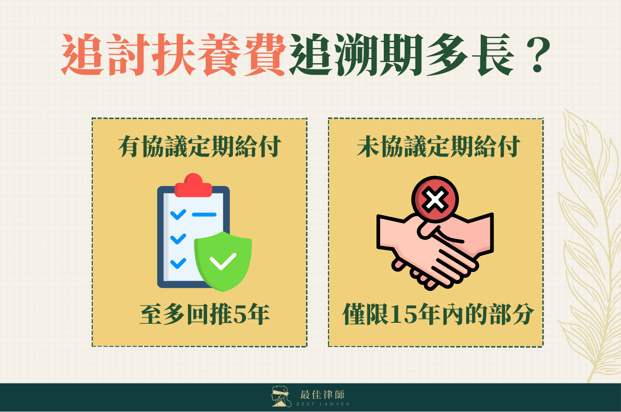 若協議定期給付,阿娟現在最多只能回推5年,要求小華給付女兒13至18歲的扶養費用;而未約定定期給付則扶養費追溯期可回推15年,請求給付3至18歲未支付之費用。